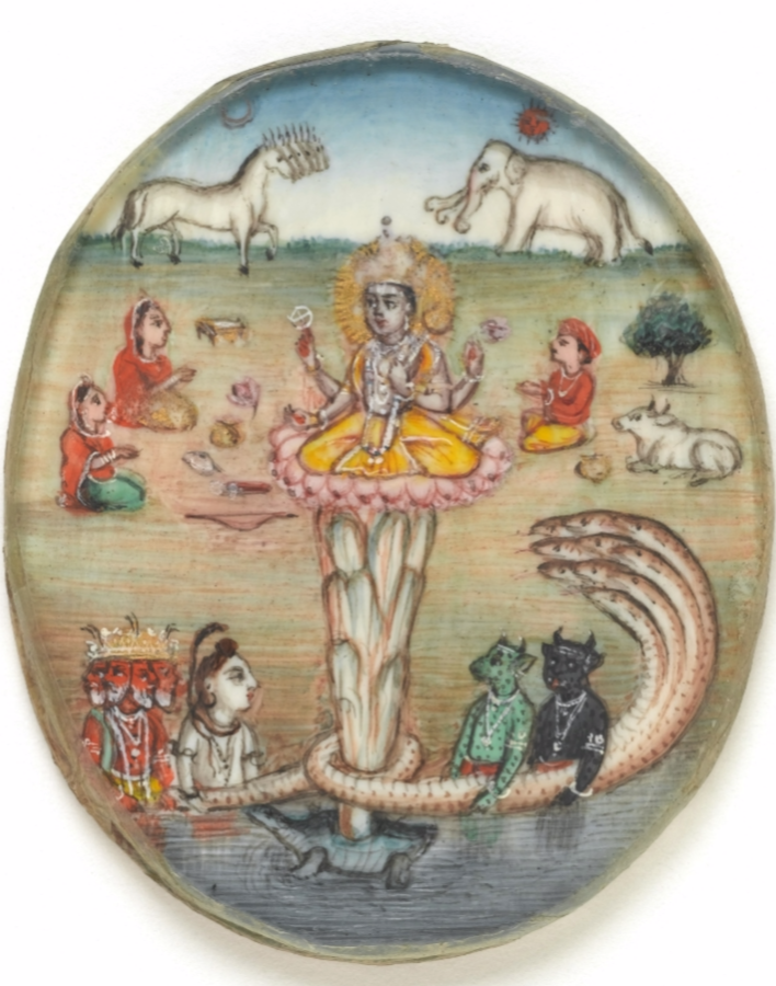A 19th-century roundel of the churning of the ocean by the gods and demons, with Vishnu in his Kurma (turtle) avatar.
